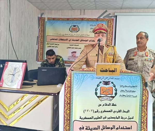 نال الباحث العميد حسن محمد أحمد القاضي، قائد اللواء 39 مدرع، اليوم، من كلية القيادة والأركان العامة – الأكاديمية العسكرية العليا بالعاصمة المؤقتة عدن، درجة الماجستير في العلوم العسكرية، عن رسالته الموسومة بعنوان (استخدام الوسائل الحديثة في الاستطلاع المدفعي).