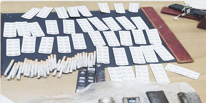 وبعد فتح الشقة، عثر على المتهم (ف.ق) مختبئا داخل إحدى الغرف، وبجواره سكين، وكيس شفاف يحتوي على مادة يشتبه بأنها حشيش، وبقايا حبوب مخدرة من نوع بريجبالين، إضافة إلى واقٍ ذكري وعدد من الهواتف المحمولة، فيما كانت رائحة الخمور تفوح بوضوح من المكان.