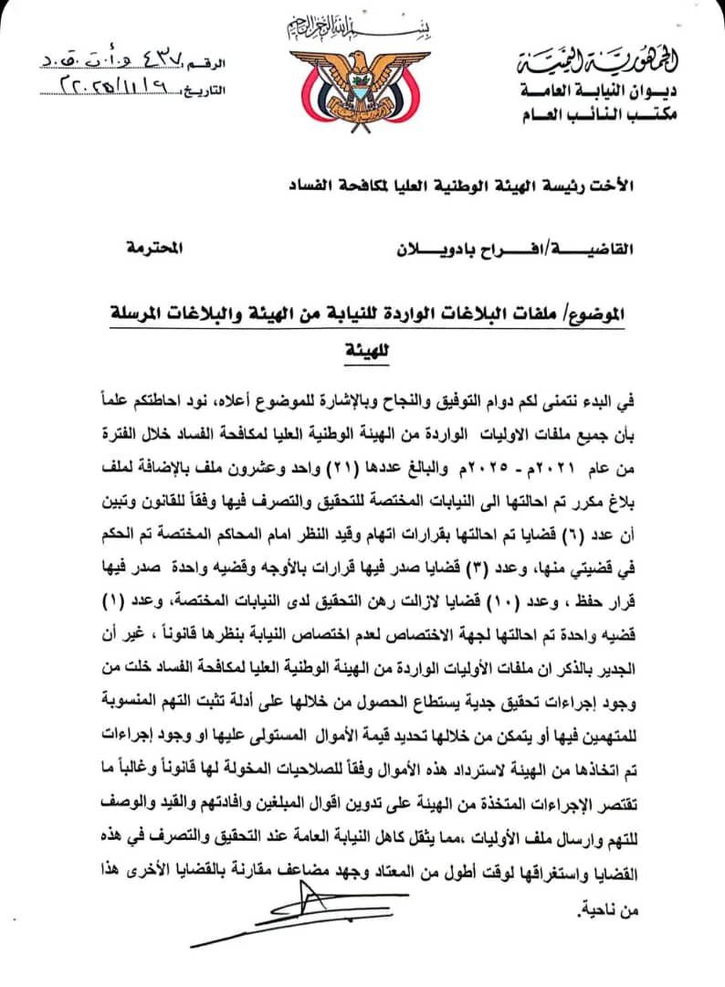وجّه النائب العام القاضي قاهر مصطفى، مذكرة إلى رئيسة الهيئة الوطنية العليا لمكافحة الفساد القاضية أفراح بادويلان، بشأن ملفات البلاغات المتبادلة بين النيابة العامة والهيئة خلال الأعوام 2021 – 2025م.