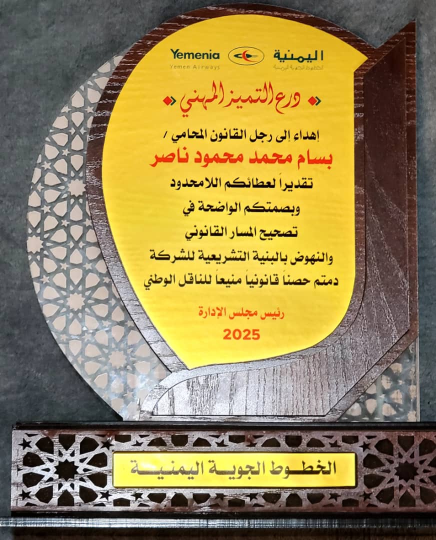 عدن /14أكتوبر/ خاصقدّم مجلس إدارة الخطوط الجوية اليمنية، اليوم، شهادة شكر وعرفان للأستاذ المحامي بسام محمد محمود ناصر، مدير إدارة الشؤون القانونية بالشركة، تقديرًا لجهوده المخلصة ودوره المحوري في تصحيح المسار القانوني للناقِل الوطني، وإسهاماته البارزة في تعزيز العمل المؤسسي داخل الشركة.وأشاد رئيس مجلس الإدارة، الكابتن ناصر محمود محمد، بما قدمه المحامي بسام من تفانٍ مهني وحِسٍّ وطني عالٍ، كان له الأثر الواضح في النهوض بالبنية القانونية للشركة وترسيخ أسس الحوكمة والانضباط التشريعي، مشيرًا إلى أن ما بذله من جهود شكّل دعامة أساسية لمسيرة التطوير في القطاع القانوني باليمنية.وفي إطار هذا التكريم، سلّم رئيس مجلس الإدارة درعًا تذكاريًا للمحامي بسام محمد محمود ناصر، تقديراً لعطائه اللامحدود وبصمته الواضحة في تصحيح المسار القانوني والنهوض بالبنية التشريعية للشركة. وأكدت الخطوط الجوية اليمنية أن هذا التكريم يأتي وفاءً وعرفانًا للكفاءات الوطنية التي تبذل جهودًا استثنائية للحفاظ على مكانة الشركة وسمعتها، وترسيخ مبادئ العمل المؤسي وتطوير أدائها بما يخدم مصلحة الوطن والمواطن.