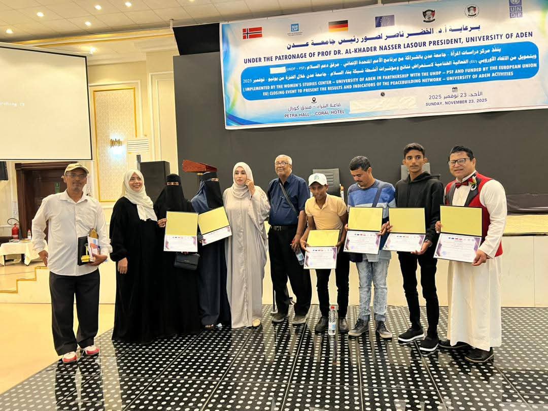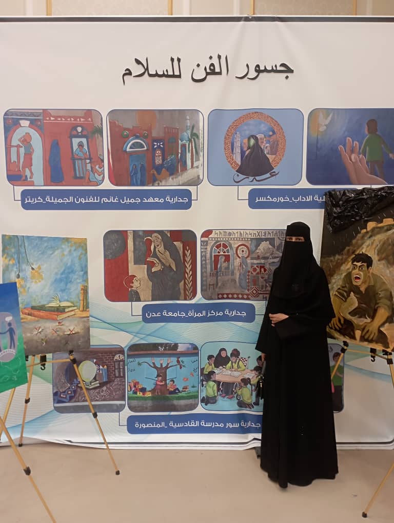 عدن/14أكتوبر/أشجان المقطرياختُتِم في العاصمة عدن، مشروع «جسور السلام »، مسابقة «رسام السلام »، إلى جانب خمسة مشاريع أخرى، وهو مشروع تنفّذه شبكة بناء السلام والعدالة بين الجنسين، بالشراكة مع برنامج الأمم المتحدة الإنمائي UNDP( (، وتحت مظلّة مركز المرأة للبحوث والتدريب - جامعة عدن. حيث حصد رسامو الجداريات المركز الثاني، ومن ضمن الفائزين بالمركز الثاني الفنانة التشكيلية سعاد الحداد عن لوحاتها الجدارية التراثية، وتم تنفيذ العمل في مركز المرأة للبحوث بجامعة عدن. واللوحة الأولى بعنوان: «عدن ثقافة وفن » العبارة مكتوبة بخط المسند في أسفل اللوحة، وفي الأعلى كتبت بالمسند عبارة «بالسلام تبنى الأوطان »، بتقنية الحفر بالإسمنت الملون، يحاكي العمل الموروث الثقافي من حرف يدوية ومهن عريقة كمهنة الصيد وصنع الفخار، وتوضح جمال العمارة العدنية واللبس التقليدي والزخارف الموجودة في البيوت، فعدن كانت ولا تزال رمزا للثقافة والتراث والاصالة.هذه اللوحة عمل فني تراثي يمزج بين الرموز الشعبية واللمسات التشكيلية الحديثة بألوان محدودة: الأحمر، الأزرق السماوي، والبيج، حيث تستحضر اللوحة التراث العدني بشكل خاص، من خلال تصوير الحياة اليومية للناس، والحِرف، والبيئة الساحلية.والهدف هو توثيق التراث والحياة الاجتماعية، وتوثيق علاقة العدنيين بالبحر والصيد والتجارة البحرية، وكذلك إبراز دور الحرفيين في المجتمع، مع استخدام أسلوب تجريدي مبسط مثل الفن الجداري القديم. الفنانة تهدف إلى إحياء الذاكرة الشعبية وتقديم مشاهد من الراث العدني في قالب بصري حديث.
