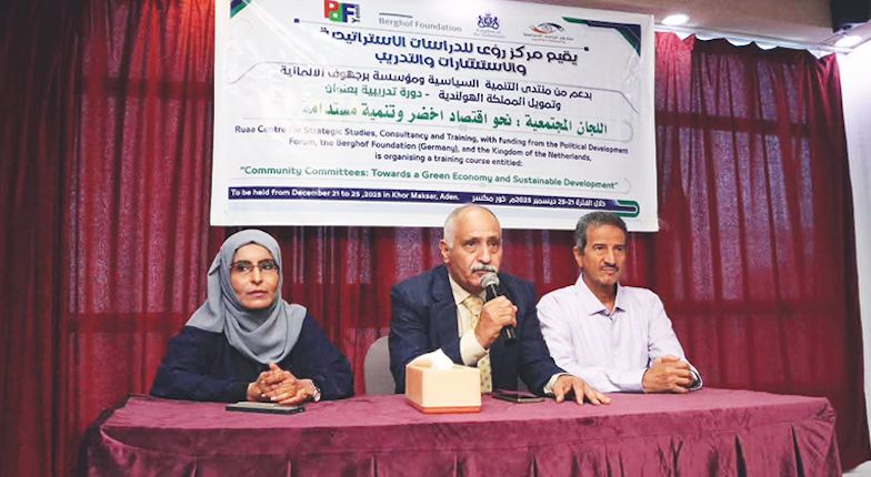 في إطار الجهود الرامية إلى تعزيز العمل المجتمعي المنظّم، ودعم التوجّه نحو تبنّي مفاهيم الاقتصاد الأخضر والتنمية المستدامة، نظم مركز رؤى للدراسات الاستراتيجية والاستشارات والتدريب، في العاصمة عدن، دورة تدريبية متخصصة بعنوان «اللجان المجتمعية: نحو اقتصاد أخضر وتنمية مستدامة»، بدعم من منتدى التنمية السياسية ومؤسسة برجهوف الألمانية، وبتمويل من المملكة الهولندية، وبمشاركة واسعة لقيادات اللجان المجتمعية في مديريات العاصمة عدن.