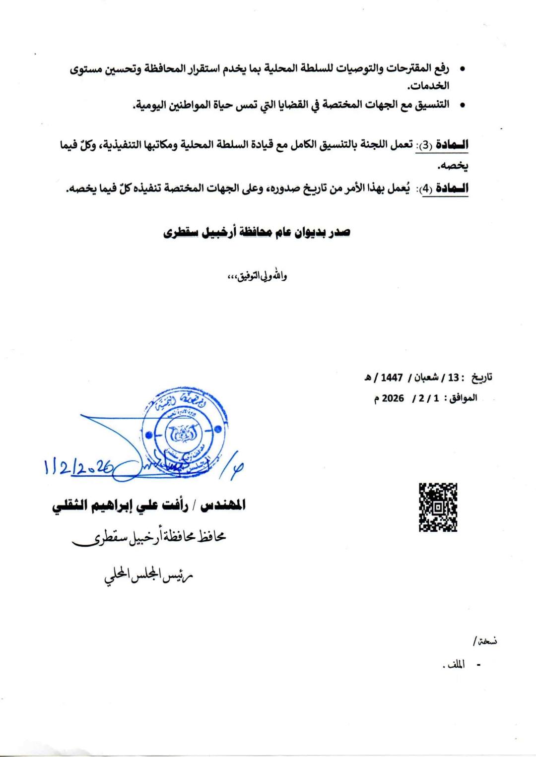 سقطرى/14أكتوبر/خاص:أصدر محافظ محافظة أرخبيل سقطرى المهندس رأفت الثقلي، أمرًا إداريًا رقم (6) لسنة 2026م، يقضي بتشكيل لجنة من مشايخ وأعيان المحافظة، وذلك في إطار تعزيز الدور المجتمعي ودعم جهود السلطة المحلية في مواجهة التحديات الخدمية والمعيشية التي تمر بها المحافظة.ويأتي هذا الأمر استنادًا إلى قانون السلطة المحلية رقم (4) لسنة 2000م ولائحته التنفيذية، والقرارات ذات الصلة الصادرة عن محافظ المحافظة، إضافة إلى مخرجات اجتماع السلطة المحلية المنعقد بتاريخ 13 يناير 2026م برئاسة المحافظ مع مشايخ المحافظة، والذي أكد أهمية تشكيل لجنة مجتمعية تسهم في تعزيز التماسك الاجتماعي ودعم الاستقرار.وبموجب الأمر الإداري، نصت المادة الأولى تشكيل اللجنة تسمى «لجنة مشايخ سقطرى للخدمات والتوعية المجتمعية»، برئاسة الشيخ محمد دولي عبدالله، وعضوية كلٍّ من: أحمد محمد سالم عبدالله، فائز عبدالله سالم، عبدالله سالم علي، أحمد عيسى سياكه، يحيى معاد بن حمود، محمد أحمد سعيد حمدية، عبدالمعز يحيى عامر عيسى، علي صالح سعيد، منير علي سالم، شفيق محمد سعد بن عليان، مبارك محمد سعيد الدولة، معاذ سالم عبدالله بن حبشي، علي سالم عمر، سعيد مالك سعيد، يحيى سالم حسن، حسن محمد حسن القيسي، سعد اطن سعيد الصيدهي،