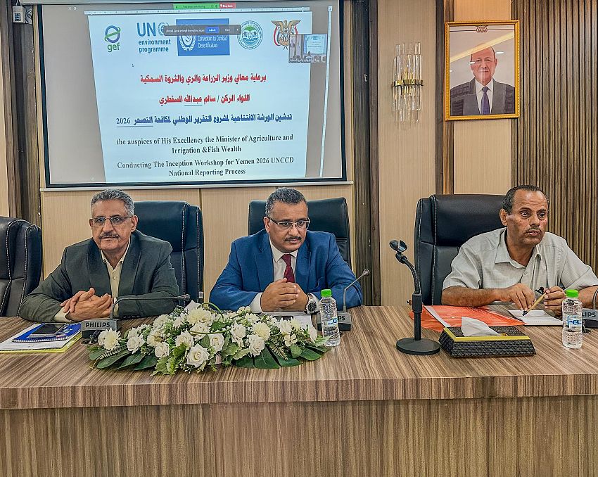 دشّنت وزارة الزراعة والري والثروة السمكية، ممثلة بقطاع الري واستصلاح الأراضي، اليوم، الورشة الافتتاحية لمشروع إعداد التقرير الوطني لمكافحة التصحر 2026 في اليمن، الجاري إعداده بدعم من مرفق البيئة العالمي.