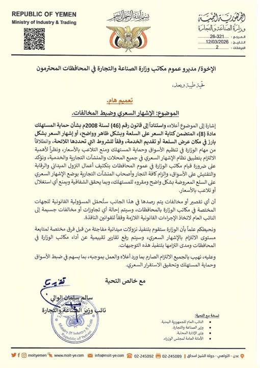 عدن/14أكتوبر/خاص:وجهت وزارة الصناعة والتجارة تعميماً إلى مديري عموم مكاتبها في المحافظات، بضرورة تكثيف الرقابة الميدانية وضبط المخالفات المرتبطة بعدم الالتزام بالإشهار السعري، في إطار جهود الوزارة لتنظيم الأسواق وتعزيز حماية المستهلك ومنع التلاعب بالأسعار.وأكد التعميم الصادر عن نائب وزير الصناعة والتجارة سالم سلمان الوالي أهمية التقيد بأحكام قانون حماية المستهلك رقم (46) لسنة 2008م، ولا سيما المادة التي تلزم التجار وأصحاب المنشآت التجارية والخدمية بإشهار أسعار السلع والخدمات بصورة واضحة وظاهرة للمستهلك في أماكن العرض أو تقديم الخدمة.وشدد التعميم على ضرورة قيام مكاتب الوزارة في المحافظات بتكثيف النزول الميداني وأعمال التفتيش والرقابة على الأسواق، وإلزام جميع التجار والمنشآت التجارية بوضع الإشهار السعري بشكل واضح ومقروء على السلع المعروضة، بما يعزز الشفافية ويحمي المستهلك من أي استغلال أو تلاعب بالأسعار.وأشار إلى أن أي تقصير أو مخالفات يتم رصدها في هذا الجانب ستتحمل الجهات المختصة المسؤولية القانونية بشأنها، وسيتم إحالة التجاوزات والمخالفات الجسيمة إلى النيابة العامة لاتخاذ الإجراءات القانونية اللازمة وفقاً للقوانين النافذة.كما أوضح التعميم أن الوزارة ستنفذ نزولات ميدانية مفاجئة عبر فرق رقابية مختصة لمتابعة مستوى الالتزام بالإشهار السعري، ورفع تقارير تقييمية عن أداء مكاتب الوزارة في المحافظات ومدى التزامها بتنفيذ التوجيهات.ودعت الوزارة جميع المعنيين إلى الالتزام الصارم بمضامين التعميم والعمل بموجبه، بما يسهم في ضبط الأسواق وتعزيز الاستقرار السعري وترسيخ مبادئ حماية المستهلك.