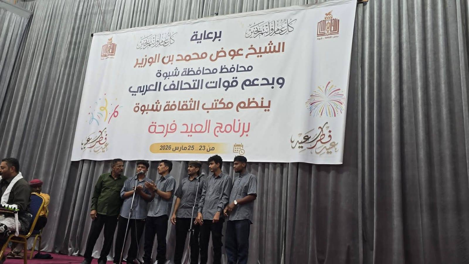 شبوة /14أكتوبر/خاص:شهدت مدينة عتق انطلاق فعاليات مهرجان "فرحة العيد"، الذي ينظمه مكتب الثقافة بالمحافظة على مسرح مركز الشاعر يسلم بن علي الثقافي، برعاية محافظ محافظة شبوة عوض محمد بن الوزير، وبدعم من قوات التحالف العربي ، في أجواء احتفالية بهيجة عكست روح العيد وأعادت للمشهد الثقافي بالمحافظة حضوره الفاعل والمتجدد.وفي حفل التدشين، أعلن وكيل محافظة شبوة أحمد صالح الدغاري انطلاق المهرجان، ناقلاً تحيات وتهاني المحافظ بن الوزير لأبناء المحافظة بمناسبة عيد الفطر المبارك، ومشيداً بمستوى التنظيم والجهود المبذولة لإدخال الفرح والسرور إلى قلوب المواطنين. وأكد أن هذه الفعاليات تجسد حالة الأمن والاستقرار التي تنعم بها شبوة، مثمناً الدعم الأخوي المستمر من الأشقاء في التحالف العربي في مختلف الجوانب التنموية والإنسانية.وشهد حفل الافتتاح حضور وكلاء المحافظة محمد أحمد الفاطمي، وسالم النسي، وسالم الأحمدي، إلى جانب عدد من مدراء عموم المكاتب التنفيذية والقيادات الأمنية والعسكرية، وجمع غفير من المواطنين الذين اكتظت بهم قاعة المركز الثقافي، في مشهد عكس حجم التفاعل المجتمعي والإقبال الكبير على الفعاليات الثقافية والترفيهية.وتخللت الفعالية باقة من الفقرات الفنية والثقافية المتنوعة، شملت قصائد شعرية معبرة تغنت بحب شبوة وأفراح العيد، من أبرزها قصيدة الشاعر أبو عقرب السليماني، إضافة إلى وصلات غنائية وموسيقية قدمها عدد من الفنانين والفرق الموسيقية، والتي لاقت استحساناً واسعاً وتفاعلاً لافتاً من الحاضرين.ويأتي تنظيم مهرجان "فرحة العيد" في إطار اهتمام قيادة المحافظة بتنشيط الحراك الثقافي والترفيهي، وإحياء الفعاليات التي تعزز من تماسك النسيج الاجتماعي، وتوفر متنفساً للأسر والشباب خلال أيام عيد الفطر المبارك، بما يعكس الصورة الإيجابية التي تعيشها المحافظة في ظل الاستقرار.الجدير بالإشارة، أن فعاليات "فرحة العيد" ستتواصل خلال الفترة من 23 وحتى 25 مارس 2026، متضمنة عروضاً فنية وثقافية وترفيهية متنوعة، تهدف إلى إبراز المواهب المحلية وتنشيط المشهد الثقافي، وتلبية تطلعات الجمهور، وتعزيز أجواء الفرح والبهجة في أوساط المجتمع.