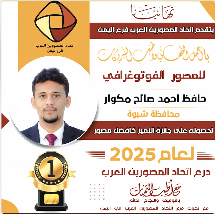 فاز المصور الفوتوغرافي حافظ احمد صالح مكوار من محافظة شبوة بجائزة أفضل مصور لعام 2025 في المسابقة السنوية السادسة، ومنحته لجنة تحكيم المكتب التنفيذي لاتحاد المصورين العرب اللقب، إضافة إلى الميدالية الذهبية، ودرع الاتحاد.